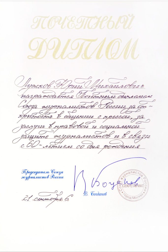 Почетный диплом Союза Журналистов России